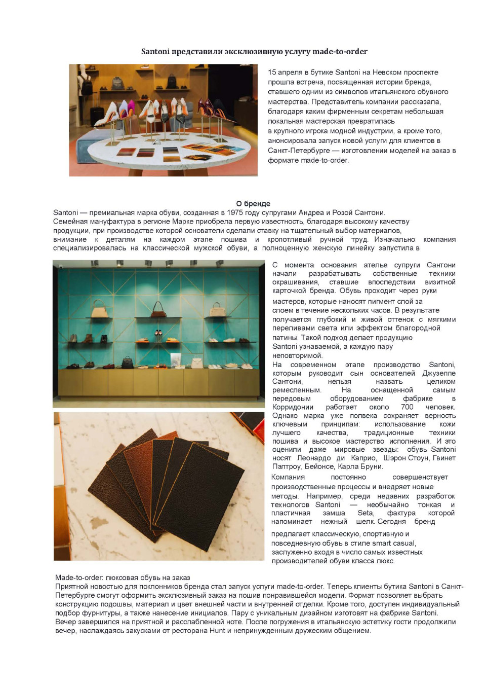Приятной новостью для поклонников бренда стал запуск услуги made-to-order. Теперь клиенты бутика Santoni* в Санкт-Петербурге смогут оформить эксклюзивный заказ на пошив понравившейся модели. Формат позволяет выбрать конструкцию подошвы, материал и цвет внешней части и внутренней отделки. Кроме того, доступен индивидуальный подбор фурнитуры, а также нанесение инициалов. Пару с уникальным дизайном изготовят на фабрике Santoni*.