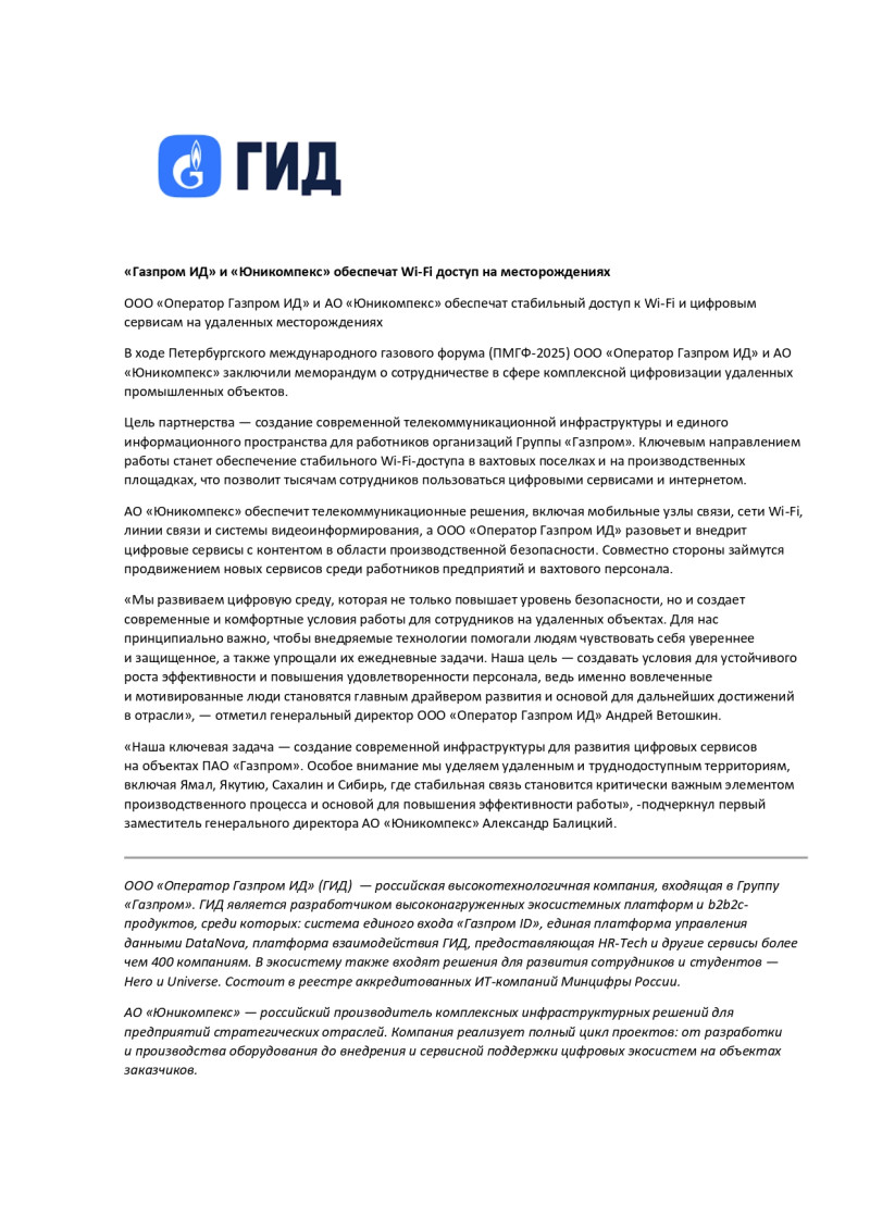 В ходе Петербургского международного газового форума (ПМГФ-2025) ООО «Оператор Газпром ИД» и АО «Юникомпекс» заключили меморандум о сотрудничестве в сфере комплексной цифровизации удаленных промышленных объектов.