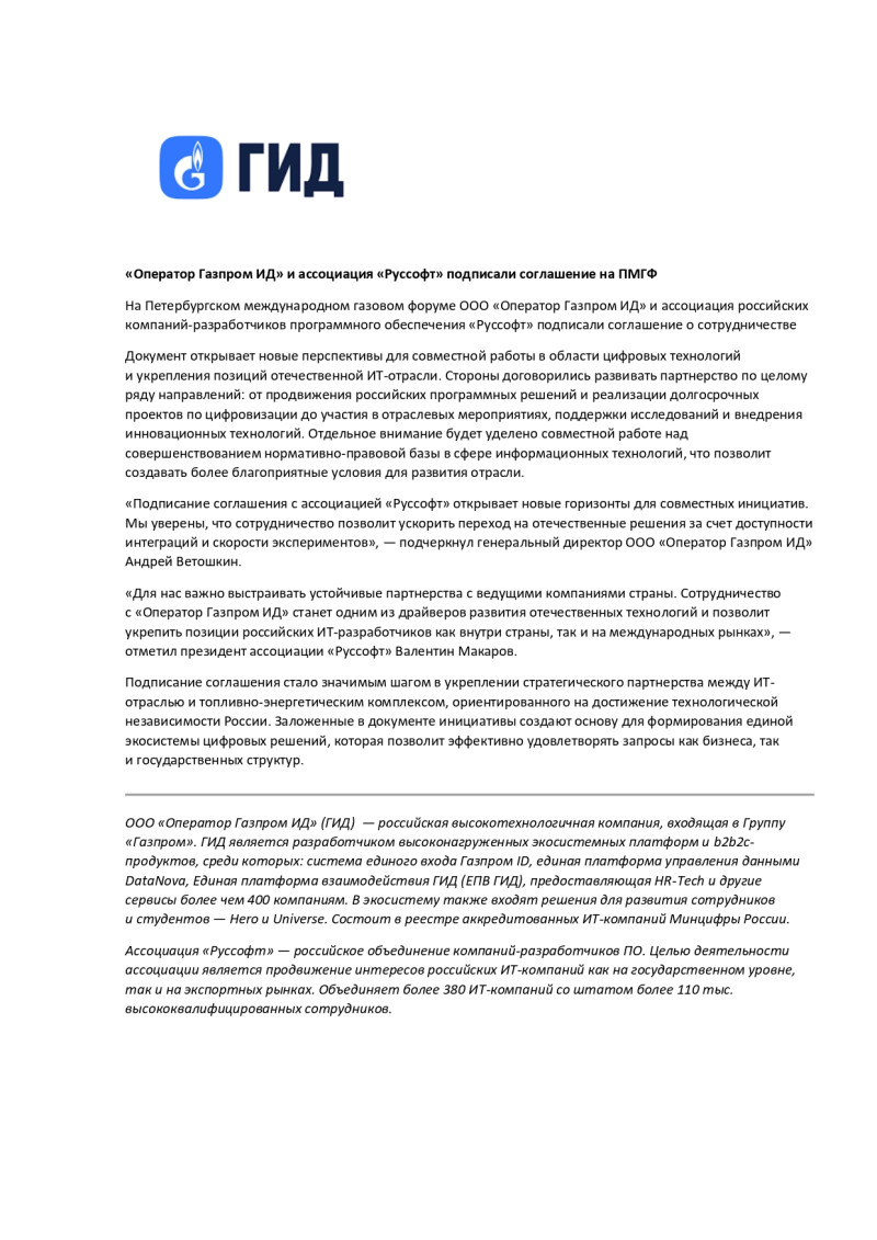 «Подписание соглашения с ассоциацией «Руссофт» открывает новые горизонты для совместных инициатив. Мы уверены, что сотрудничество позволит ускорить переход на отечественные решения за счет доступности интеграций и скорости экспериментов», — подчеркнул генеральный директор ООО «Оператор Газпром ИД» Андрей Ветошкин.