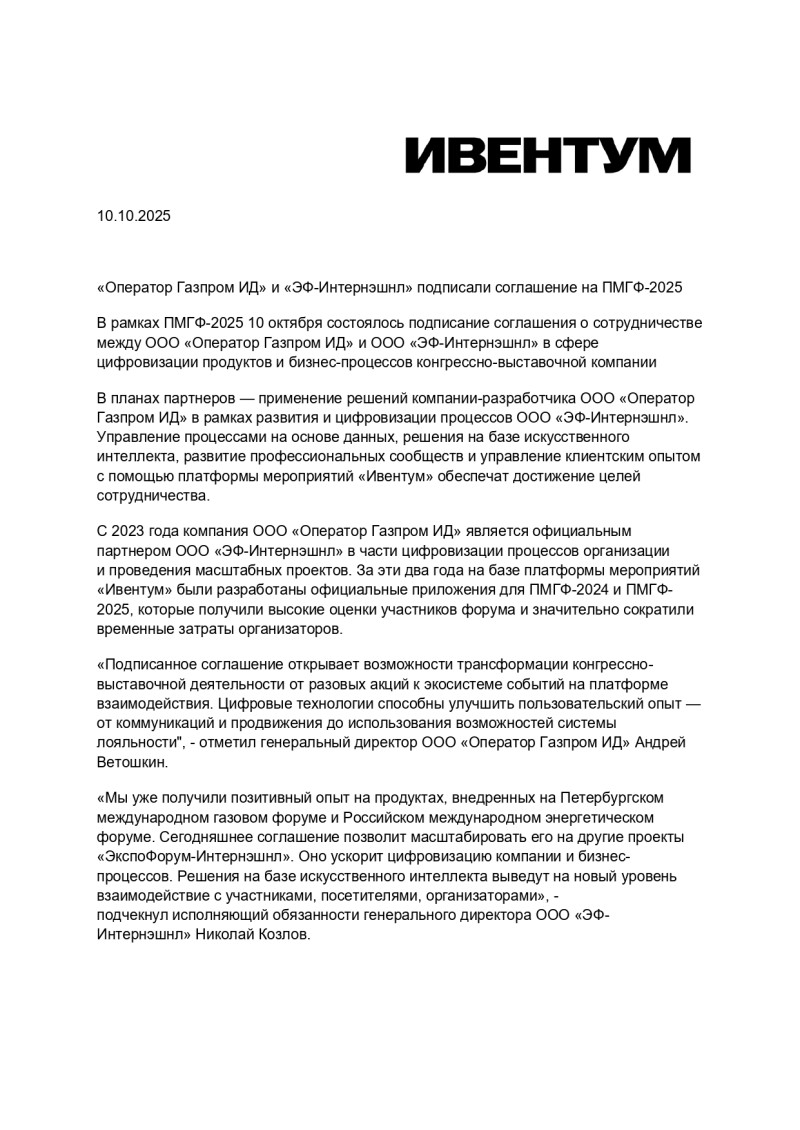 С 2023 года компания ООО «Оператор Газпром ИД» является официальным партнером ООО «ЭФ-Интернэшнл» в части цифровизации процессов организации и проведения масштабных проектов. За эти два года на базе платформы мероприятий «Ивентум» были разработаны официальные приложения для ПМГФ-2024 и ПМГФ-2025, которые получили высокие оценки участников форума и значительно сократили временные затраты организаторов.